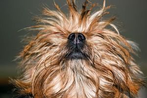 Funny shaggy red-haired domestic dog close – up